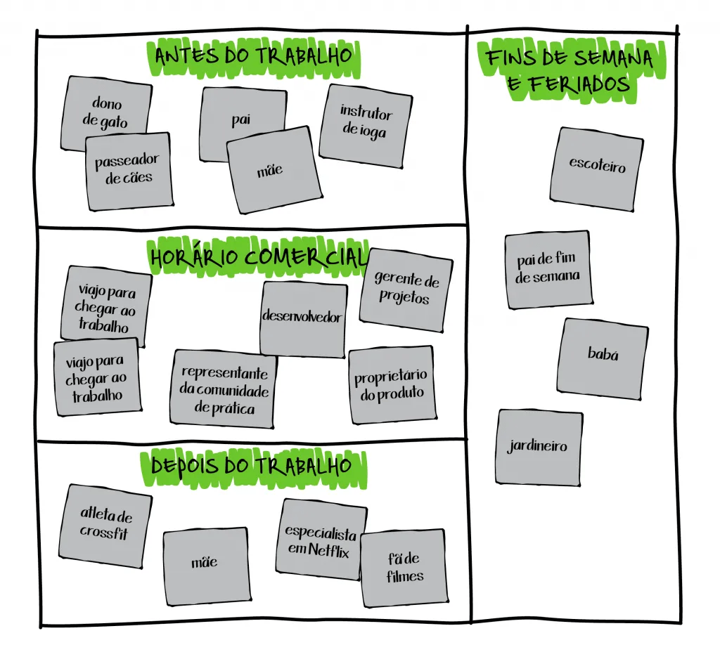 - Individualmente escreva um papel que desempenha em um post-it diferente (com suas iniciais) e coloque no local apropriado da programação da semana.