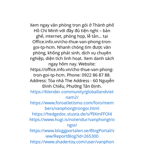 Website: https://office.info.vn/cho-thue-van-phong-tron-goi-tp-hcm. Khám phá văn phòng trọn gói ở Thành phố Hồ Chí Minh với đầy đủ tiện nghi – bàn ghế, internet, phòng họp, lễ tân… tại https://office.info.vn/cho-thue-van-phong-tron-goi-tp-hcm. Tiết