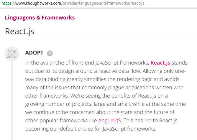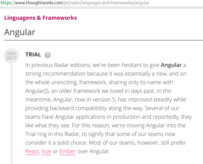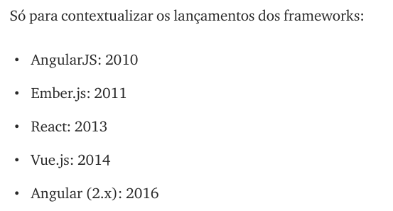 - Angular perdeu bastante espaço após as break changes do AngularJS;