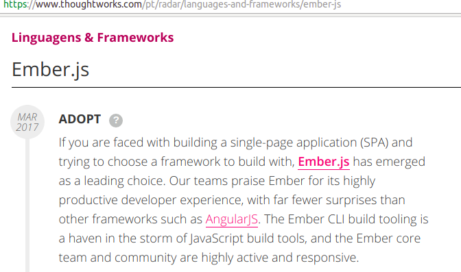 - Ember "força" os desenvolvedores a seguirem um padrão ("Ember Way"), perfeito para grandes corporações, grandes projetos e projetos que precisam escalar muito rápido;