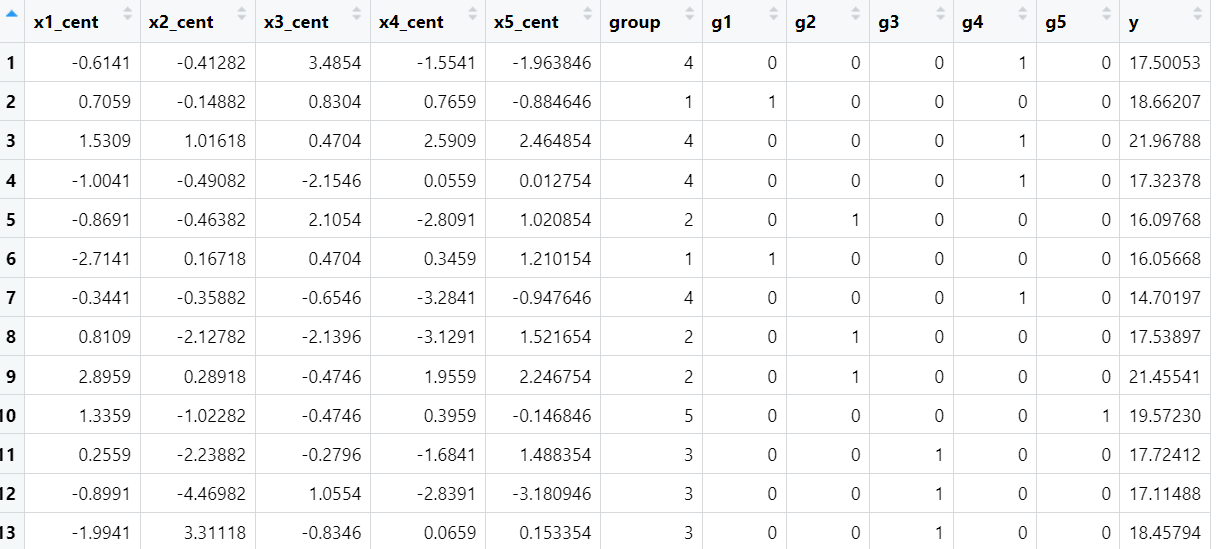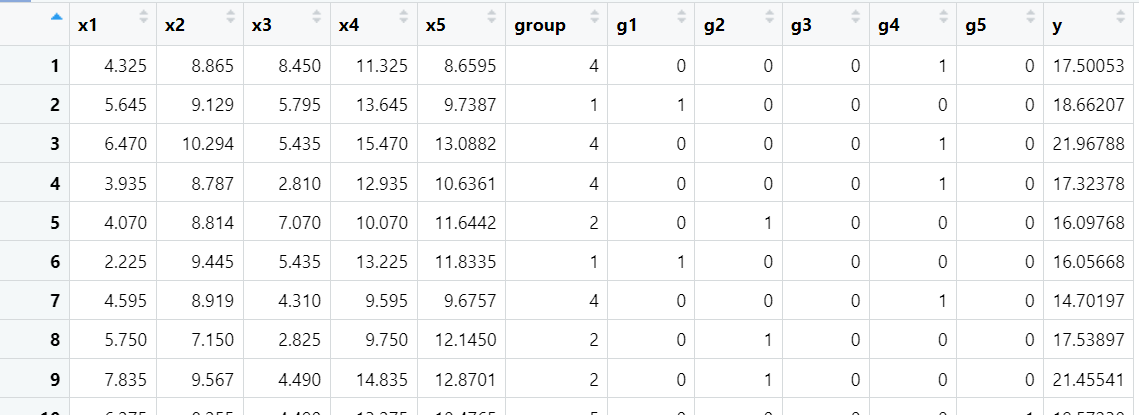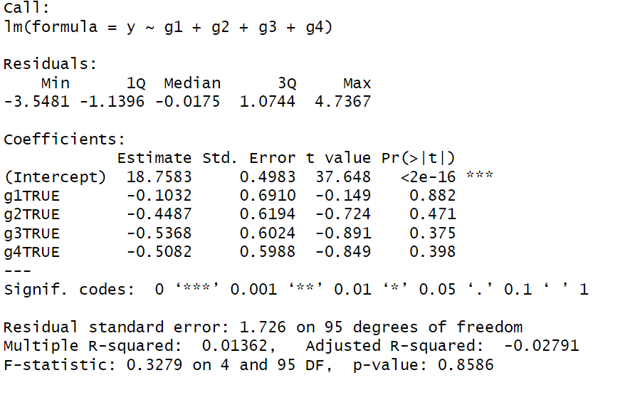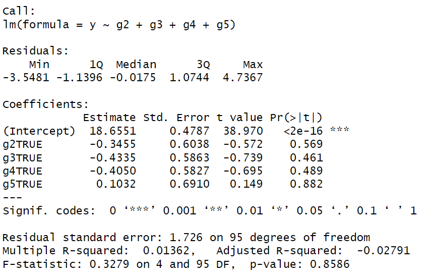 $$ y_i = \beta_0 + \beta_1 g_{i1} + \beta_2 g_{i2} + \beta_3 g_{i3} + \beta_4 g_{i4} $$