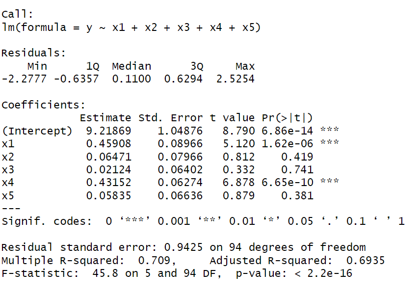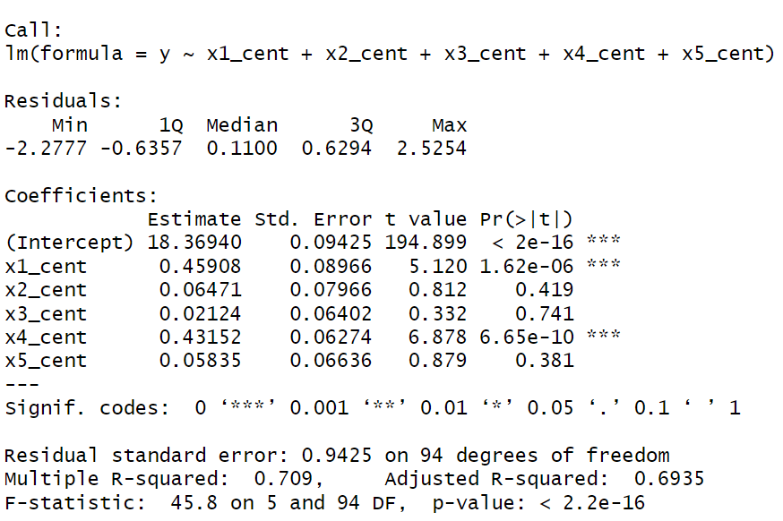 The linear regression model predicted a significant portion of the variance in our outcome, \(R^2 = .709, F(5, 94) = 45.8, p < .001\). The predictor \(x_1\) was significantly positively linked to our outcome, \(\beta_1 = 0.459, t(94) = 5.12, p < .001\) And so on...