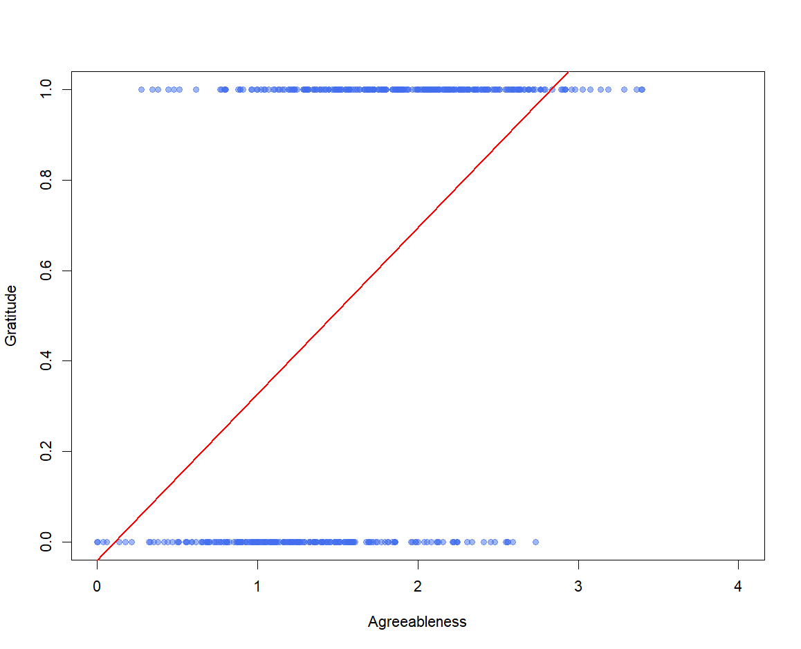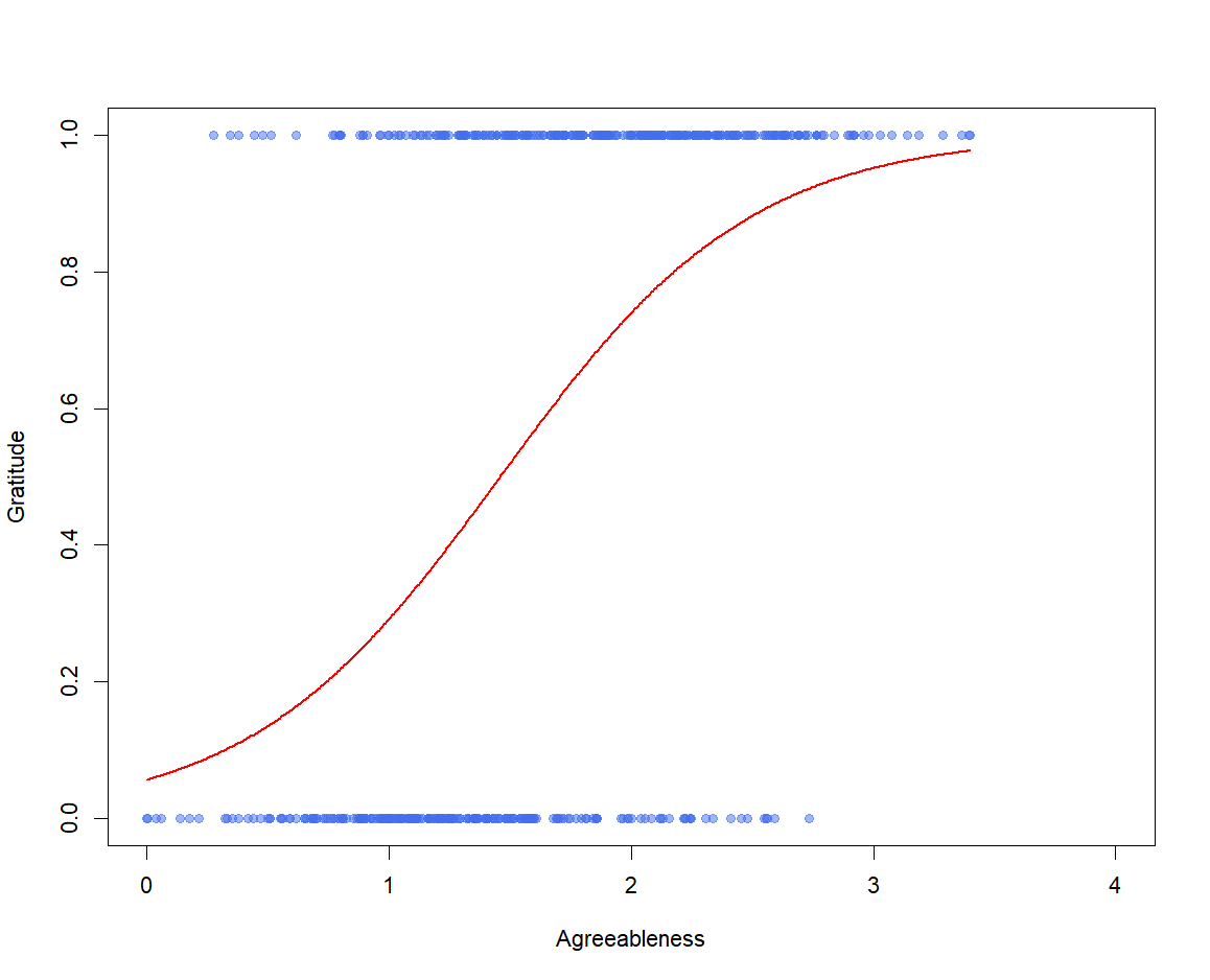 If we want a parallel to linear regression, we can interpret these in log-odds. So \(b_0\) represents the log-odds of expressing gratitude for a person whose agreeableness = 0, and \(b_1\) represents the increment in log-odds associated with a one-unit increase in agreeableness.