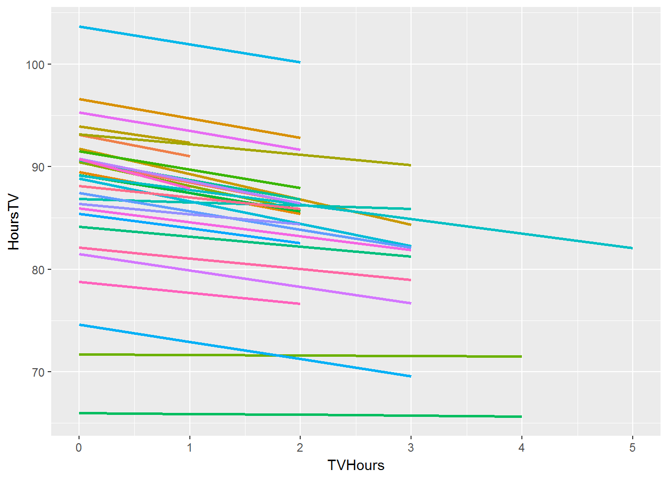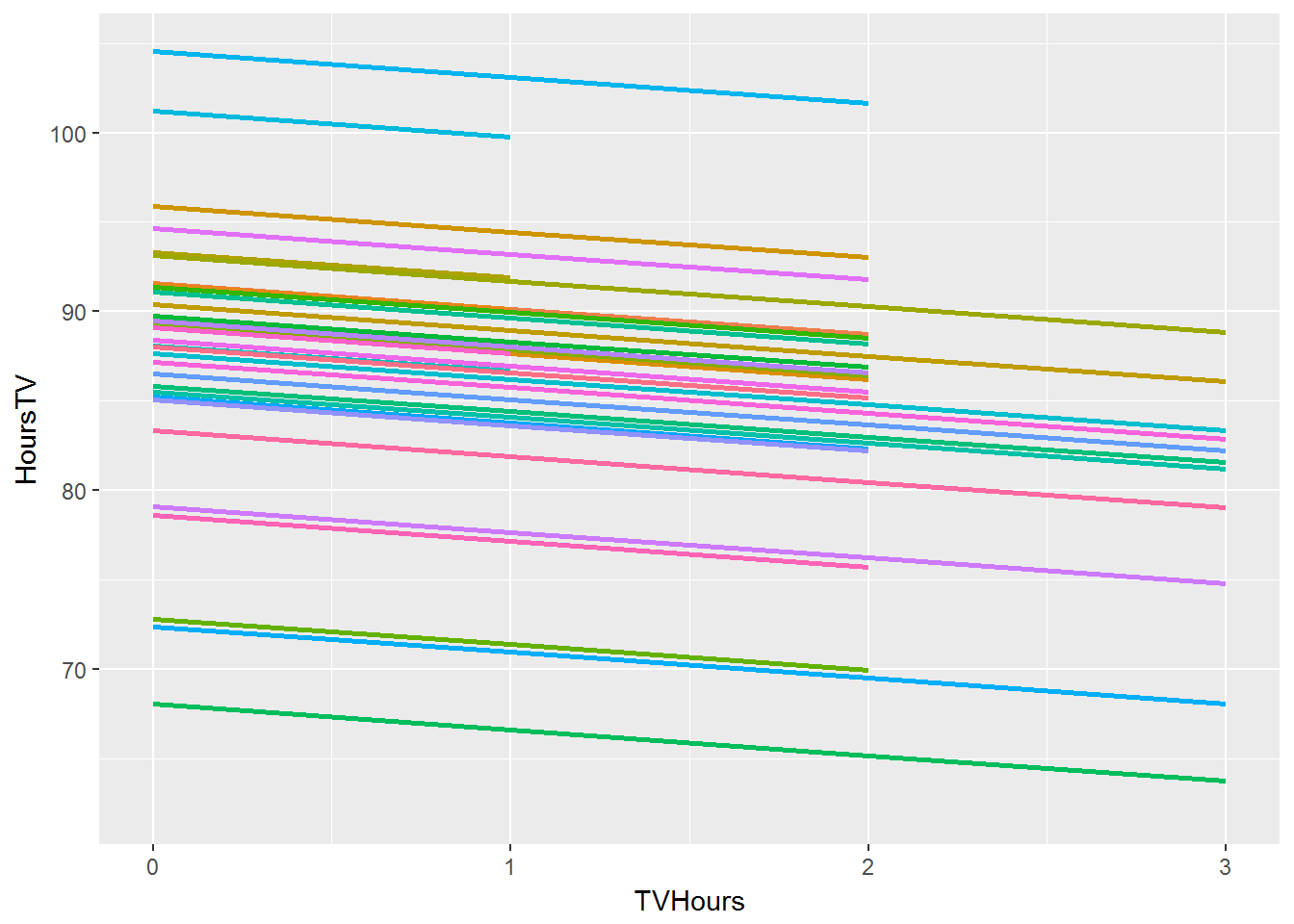 \(\beta_{1j}\) is the effect of hours of TV watched on math score for school \(j\). Note that it is the same for all schools here.