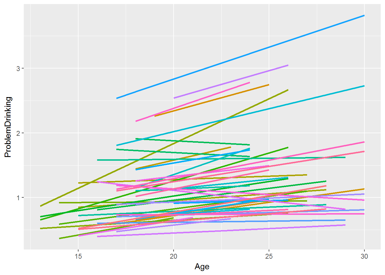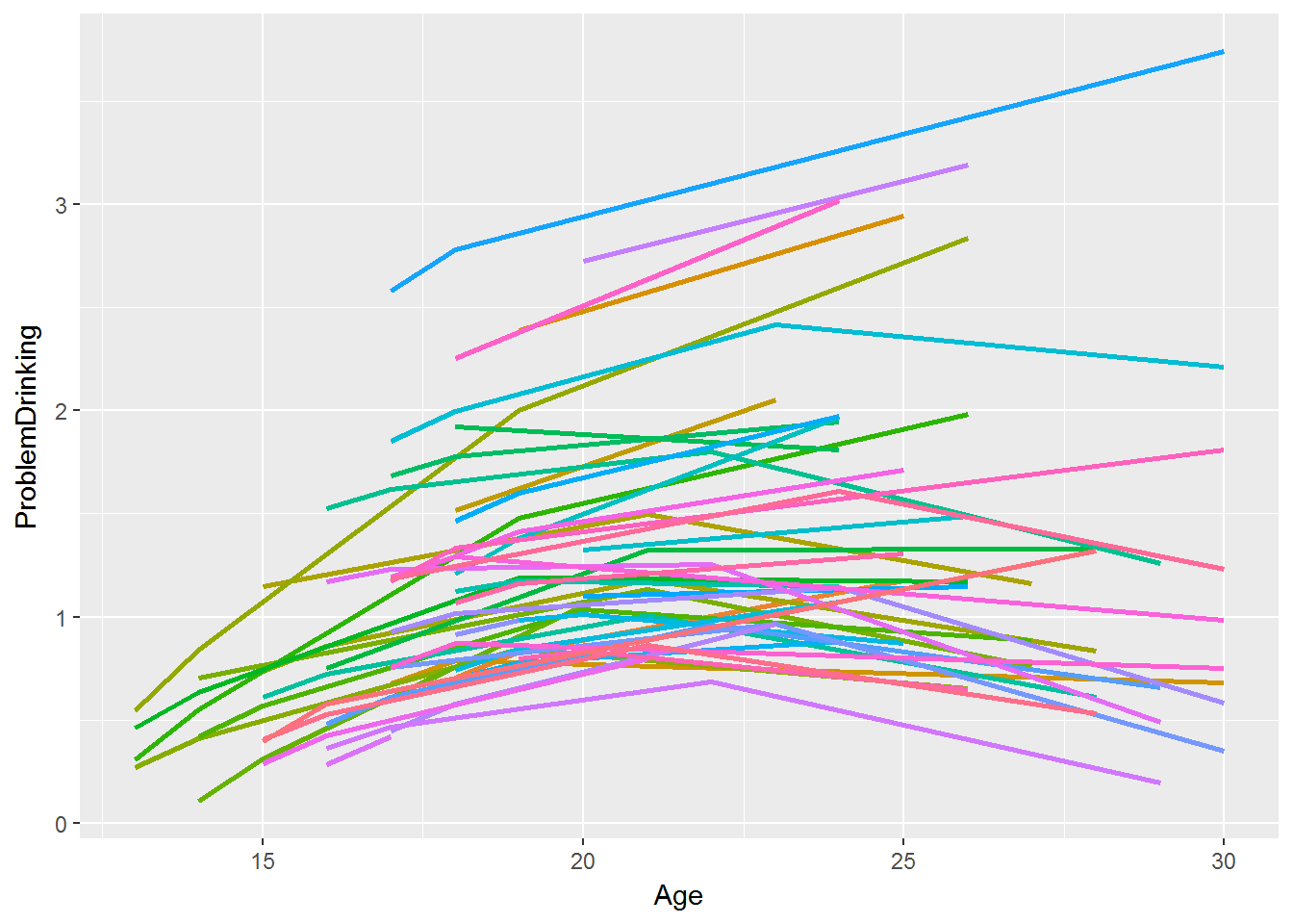 Here, \(Age_{ij}\) and \(Drinking_{ij}\) are the age and drinking score, respectively, of subject \(j\) at time \(i\), and Note that under this formulation, only the intercept can vary by person.