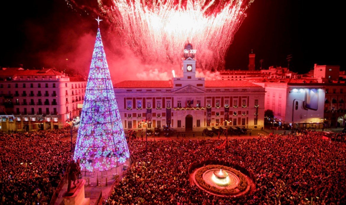 En la Puerta del Sol, en Madrid, hay una fiesta popular. Con cada campanada se come una uva para tener buena suerte.
