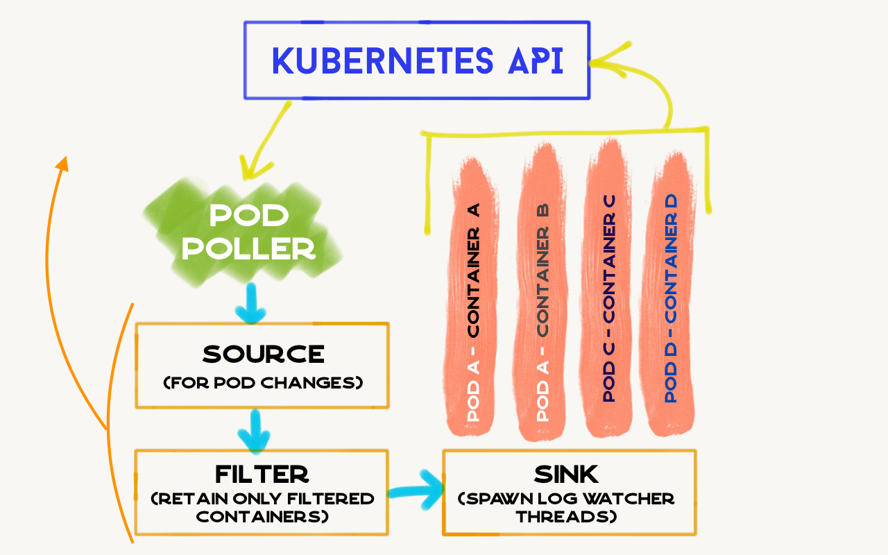 A utility to tail pod logs in the cluster (includes the container with filtering too) for Kubernetes. It will be enhanced to do more.