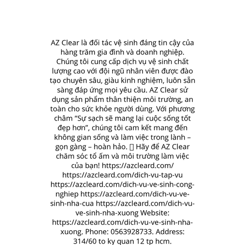 Website: https://azcleard.com/dich-vu-ve-sinh-nha-xuong. Bạn đang tìm một đơn vị vệ sinh uy tín? AZ Clear chính là lựa chọn lý tưởng! Chúng tôi mang đến giải pháp vệ sinh chuyên nghiệp cho cả gia đình và doanh nghiệp, đảm bảo hiệu quả – an toàn – t