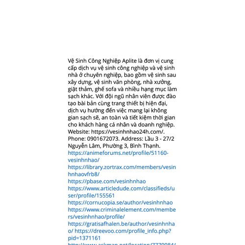 Website: https://vesinhnhao24h.com/https://vesinhnhao24h.com/ Vệ Sinh Công Nghiệp Aplite là đơn vị cung cấp dịch vụ vệ sinh công nghiệp và vệ sinh nhà ở chuyên nghiệp, bao gồm vệ sinh sau xây dựng, vệ sinh văn phòng, nhà xưởng, giặt thảm, ghế sofa và nhiều hạng mục làm sạch