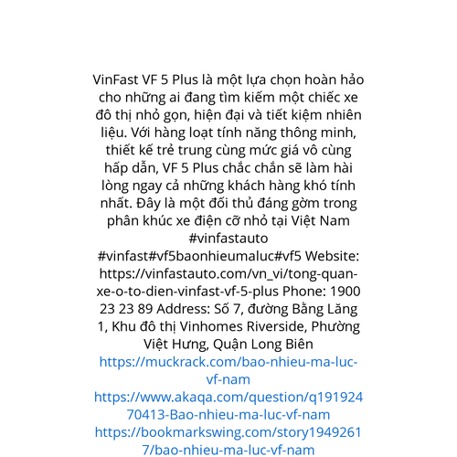 Website: https://vinfastauto.com/vn_vi/tong-quan-xe-o-to-dien-vinfast-vf-5-plus VinFast VF 5 Plus là một lựa chọn hoàn hảo cho những ai đang tìm kiếm một chiếc xe đô thị nhỏ gọn, hiện đại và tiết kiệm nhiên liệu. Với hàng loạt tính năng thông minh, t