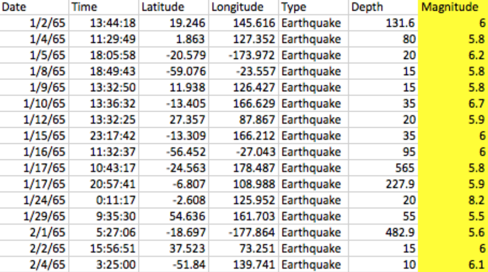['1/2/65', '13:44:18', '19.246', '145.616', 'Earthquake', '131.6', '6']