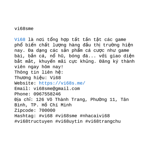 Vi68 là nơi tổng hợp tất tần tật các game phổ biến chất lượng hàng đầu thị trường hiện nay. Đa dạng các sản phẩm cá cược như game bài, bắn cá, nổ hũ, bóng đá... với giao diện bắt mắt, khuyến mãi cực khủng. Đăng ký thành viên ngay hôm nay! Thông tin l