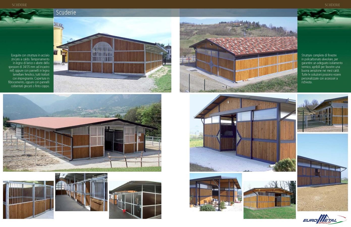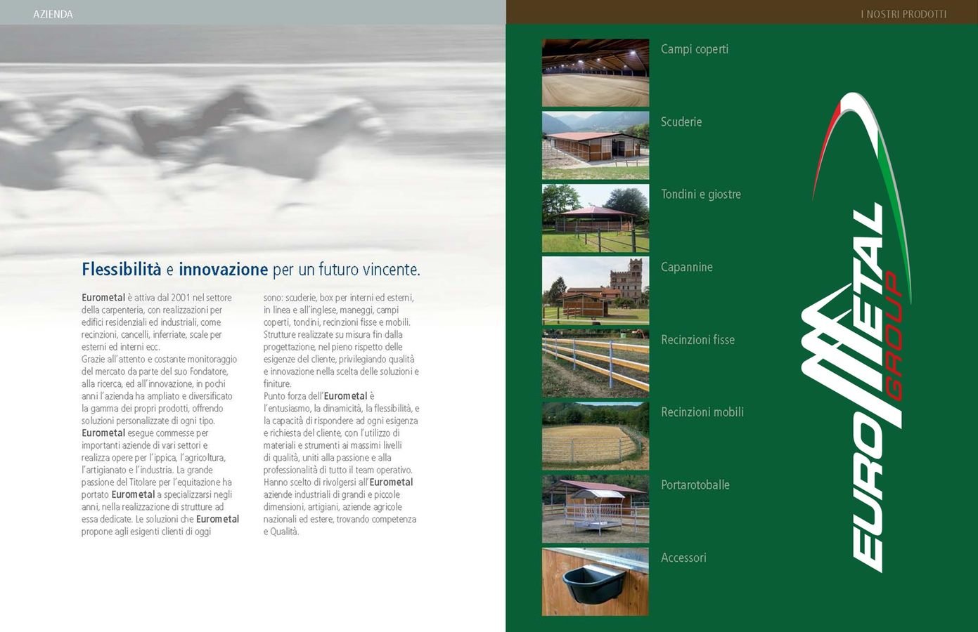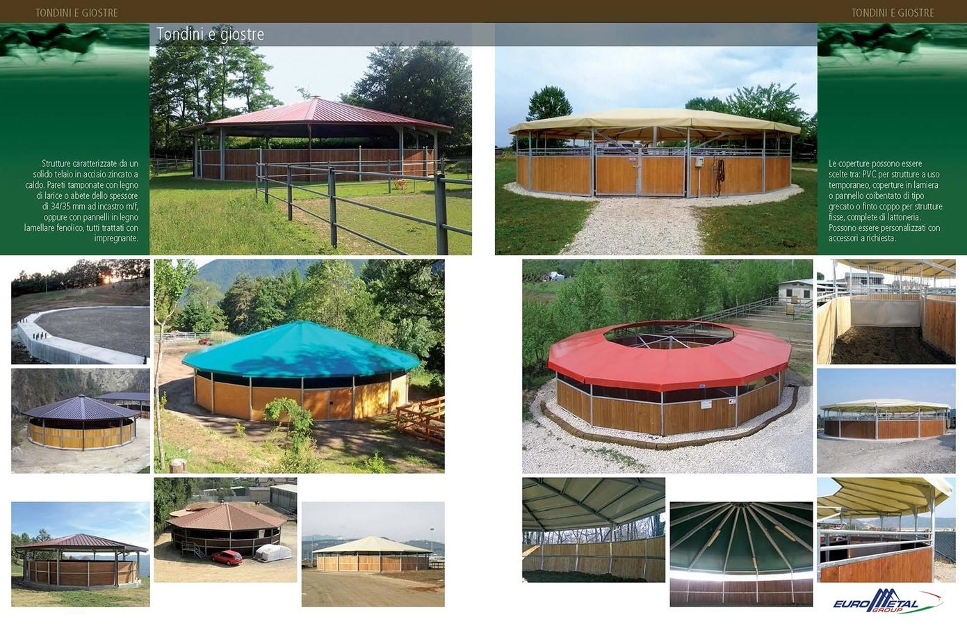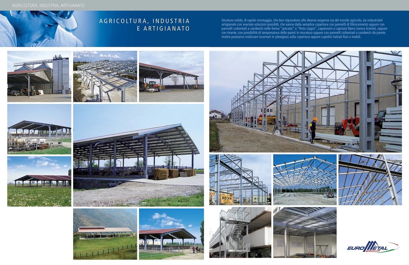 Eurometal esegue commesse per importanti aziende in vari settori e realtà sia nazionali sia estere e realizza opere di carpenteria pesante con la costruzione di: capannoni, tunnel, tettorie, interni stalle, manti di copertura, pareti di tamponamento e reti frangivento.