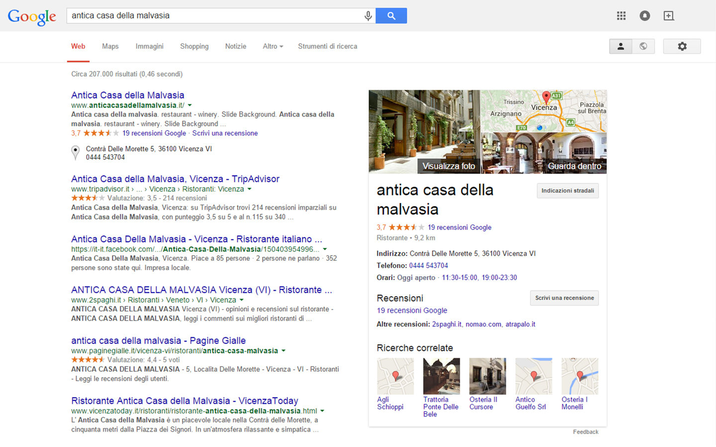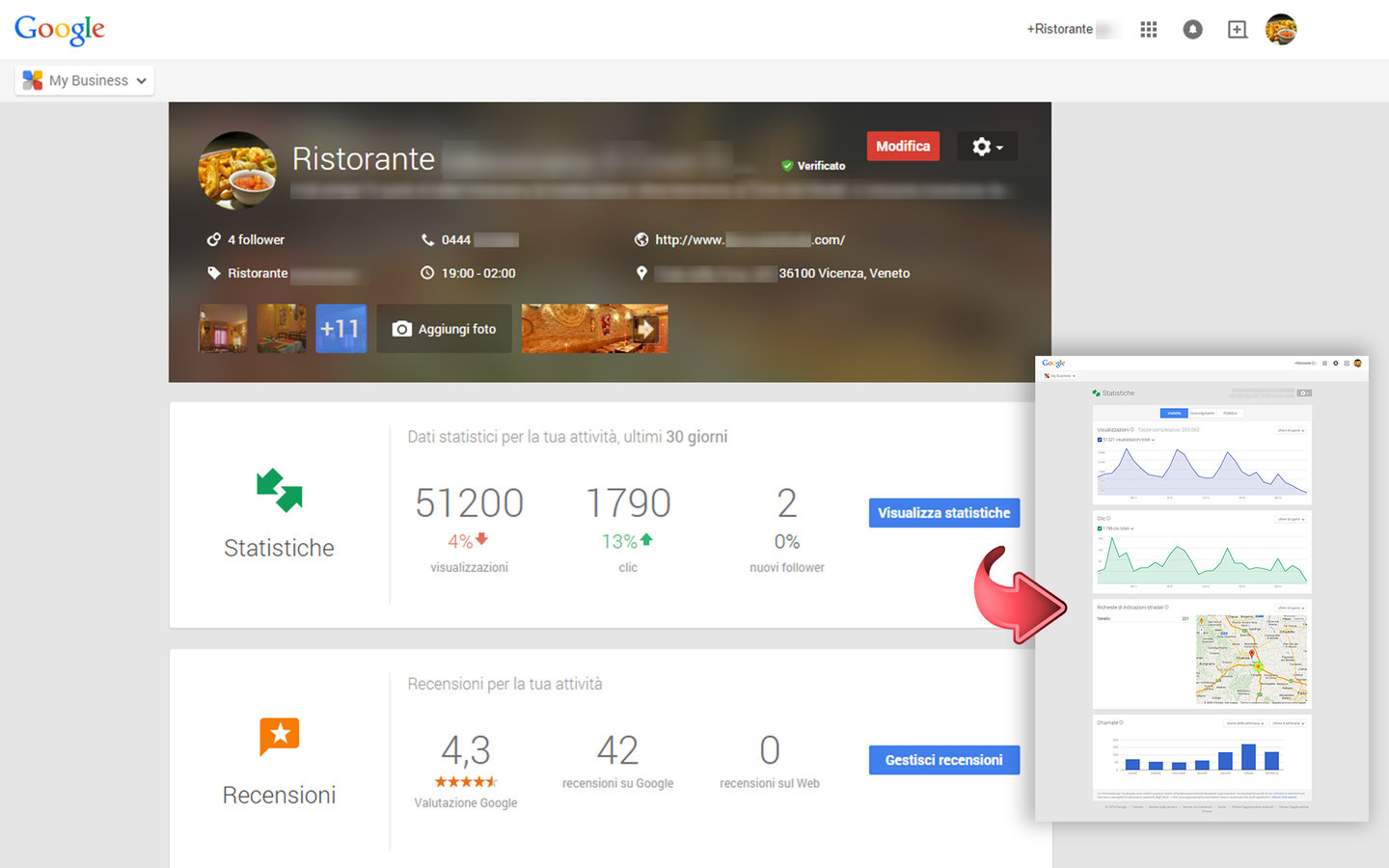 Questo è il risultato quando si cerca su Google Maps una attività, nota la completezza delle informazioni che si ripetono anche qui
