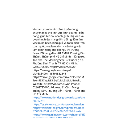 Website: https://vieclam.ai.vn/. Vieclam.ai.vn là nền tảng tuyển dụng chuyên biệt cho lĩnh vực kinh doanh - bán hàng, giúp kết nối nhanh giữa ứng viên và doanh nghiệp, mang đến trải nghiệm tìm việc minh bạch, hiệu quả và toàn diện trên toàn quốc. vie