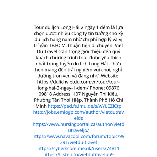 Website: https://dulichvietdu.com.vn/tour/tour-long-hai-2-ngay-1-dem/ Tour du lịch Long Hải 2 ngày 1 đêm là lựa chọn được nhiều công ty tin tưởng cho kỳ du lịch hằng năm nhờ chi phí hợp lý và vị trí gần TP.HCM, thuận tiện di chuyển. Viet Du Travel tr