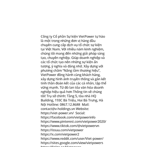 Website: https://viet-power.vn/https://viet-power.vn/ Công ty Cổ phần Sự kiện VietPower tự hào là một trong những đơn vị hàng đầu chuyên cung cấp dịch vụ tổ chức sự kiện tại Việt Nam. Với nhiều năm kinh nghiệm, chúng tôi mang đến những giải pháp sáng tạo, chuyên nghiệp.