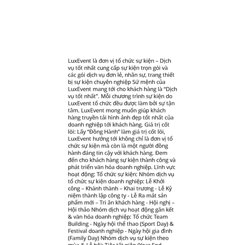 Website: https://luxevent.net/. LuxEvent là đơn vị tổ chức sự kiện – Dịch vụ tốt nhất cung cấp sự kiện trọn gói và các gói dịch vụ đơn lẻ, nhân sự, trang thiết bị sự kiện chuyên nghiệp Sứ mệnh của LuxEvent mang tới cho khách hàng là “Dịch vụ tốt nhất