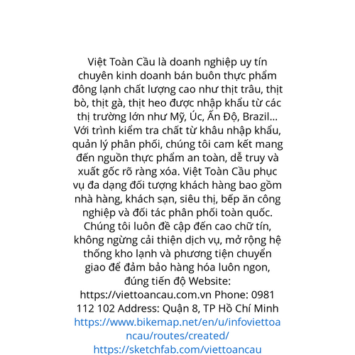 Website: https://viettoancau.com.vn Việt Toàn Cầu là doanh nghiệp uy tín chuyên kinh doanh bán buôn thực phẩm đông lạnh chất lượng cao như thịt trâu, thịt bò, thịt gà, thịt heo được nhập khẩu từ các thị trường lớn như Mỹ, Úc, Ấn Độ, Brazil… Với trình