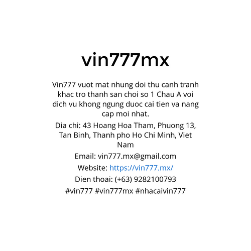 Vin777 vuot mat nhung doi thu canh tranh khac tro thanh san choi so 1 Chau A voi dich vu khong ngung duoc cai tien va nang cap moi nhat. Dia chi: 43 Hoang Hoa Tham, Phuong 13, Tan Binh, Thanh pho Ho Chi Minh, Viet Nam Email: vin777.mx@gmail.com Websi