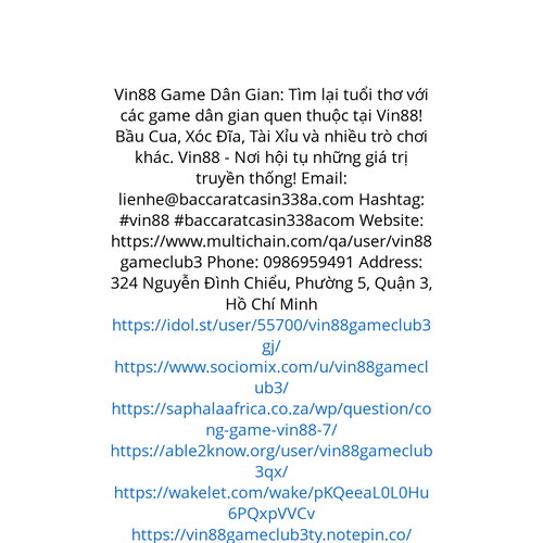 Website: https://www.multichain.com/qa/user/vin88gameclub3 Vin88 Game Dân Gian: Tìm lại tuổi thơ với các game dân gian quen thuộc tại Vin88! Bầu Cua, Xóc Đĩa, Tài Xỉu và nhiều trò chơi khác. Vin88 - Nơi hội tụ những giá trị truyền thống! Email: l