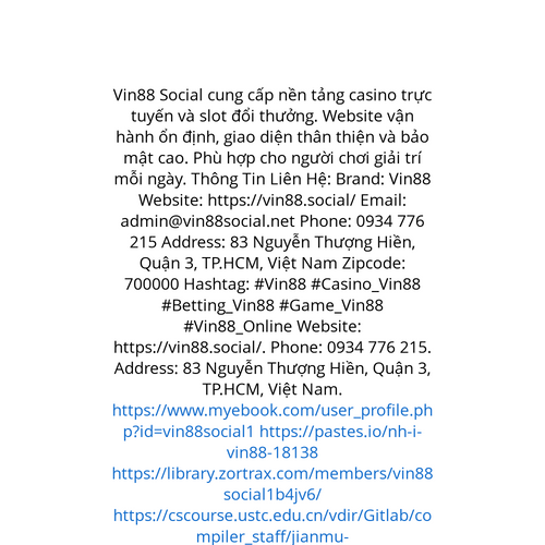Website: https://vin88.social/. Vin88 Social cung cấp nền tảng casino trực tuyến và slot đổi thưởng. Website vận hành ổn định, giao diện thân thiện và bảo mật cao. Phù hợp cho người chơi giải trí mỗi ngày. Thông Tin Liên Hệ: Brand: Vin88 Website: ht