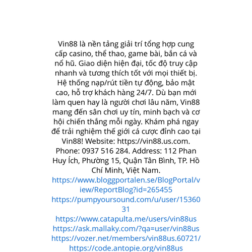 Website: https://vin88.us.com. Vin88 là nền tảng giải trí tổng hợp cung cấp casino, thể thao, game bài, bắn cá và nổ hũ. Giao diện hiện đại, tốc độ truy cập nhanh và tương thích tốt với mọi thiết bị. Hệ thống nạp/rút tiền tự động, bảo mật cao, hỗ trợ