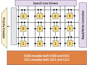 - Ternary Content Addressable Memories are capable of encoding don't cares "X" in addition to 0s and 1s