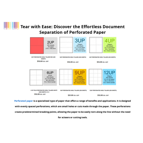 At Vision Supply, we provide a wide range of standard and custom perforated paper across various industries in Australia. Our best-selling products include perforated shelf talkers and shelf tickets for retailers and wholesalers. Our perforated paper and perforated shelf tickets are an easy way to produce shelf labels. The tickets are made of medium-weight paper joined by perforations. The tickets can be printed on and can then be separated easily by tearing. On the other hand, perforated shelf talkers are used by retailers to draw attention to specific products and promotions on store shelves.