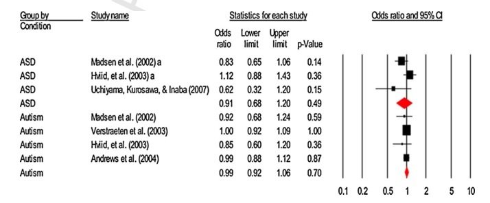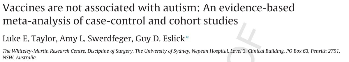 Taylor, L. E., Swerdfeger, A. L., & Eslick, G. D. (2014). Vaccines are not associated with autism: an evidence-based meta-analysis of case-control and cohort studies. Vaccine, 32(29), 3623–3629. http://doi.org/10.1016/j.vaccine.2014.04.085