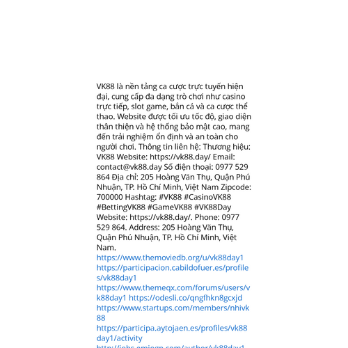 Website: https://vk88.day/https://vk88.day/ VK88 là nền tảng ca cược trực tuyến hiện đại, cung cấp đa dạng trò chơi như casino trực tiếp, slot game, bắn cá và ca cược thể thao. Website được tối ưu tốc độ, giao diện thân thiện và hệ thống bảo mật cao, mang đến trải n
