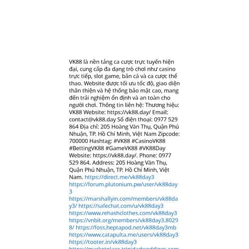 Website: https://vk88.day/. VK88 là nền tảng ca cược trực tuyến hiện đại, cung cấp đa dạng trò chơi như casino trực tiếp, slot game, bắn cá và ca cược thể thao. Website được tối ưu tốc độ, giao diện thân thiện và hệ thống bảo mật cao, mang đến trải n