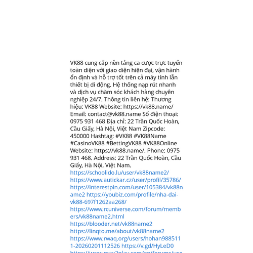 Website: https://vk88.name/. VK88 cung cấp nền tảng ca cược trực tuyến toàn diện với giao diện hiện đại, vận hành ổn định và hỗ trợ tốt trên cả máy tính lẫn thiết bị di động. Hệ thống nạp rút nhanh và dịch vụ chăm sóc khách hàng chuyên nghiệp 24/7.