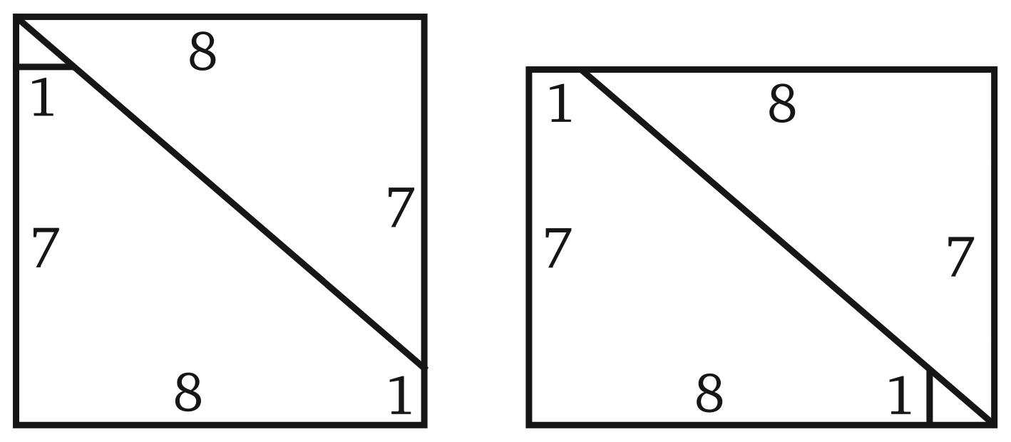 Возьмем квадрат со стороной и, следовательно, с площадью . Разрежем его на три части так, как показано на первом чертеже. Затем переложим эти части так, как показано на втором. Получается прямоугольник, площадь которого легко вычислить: