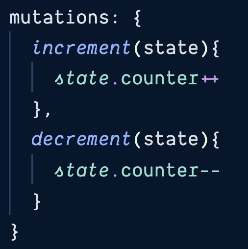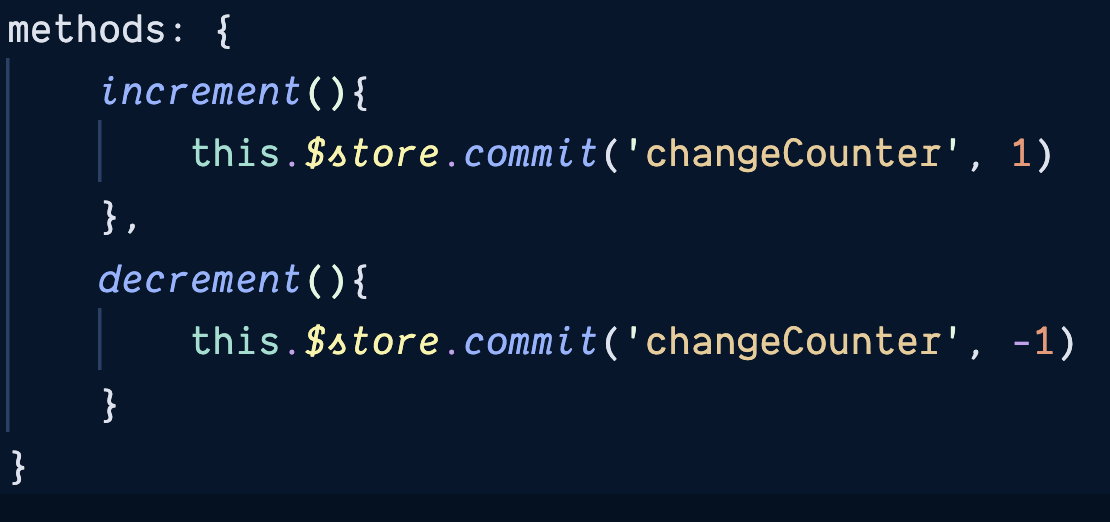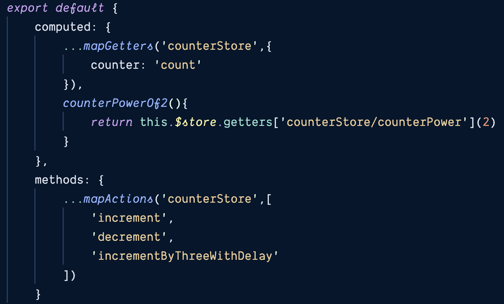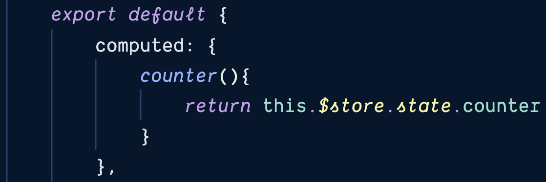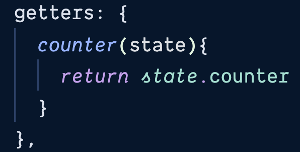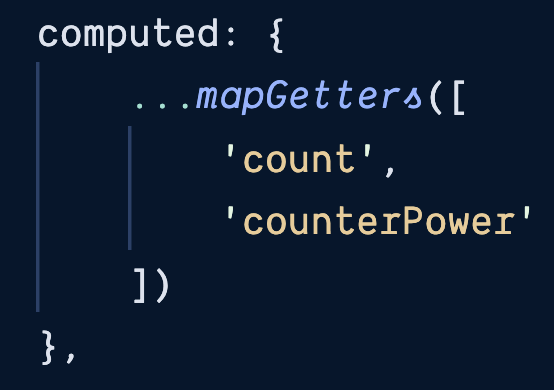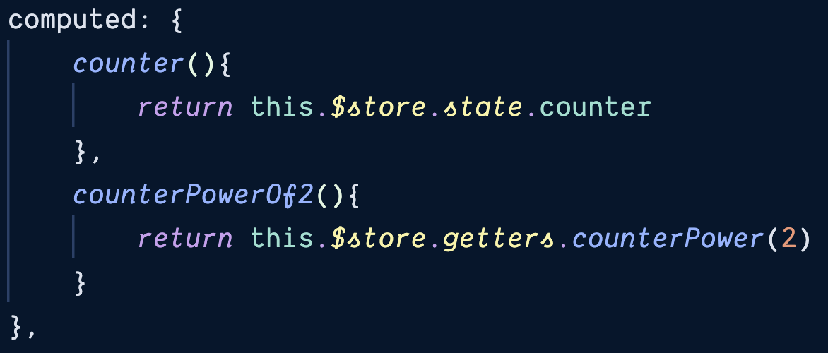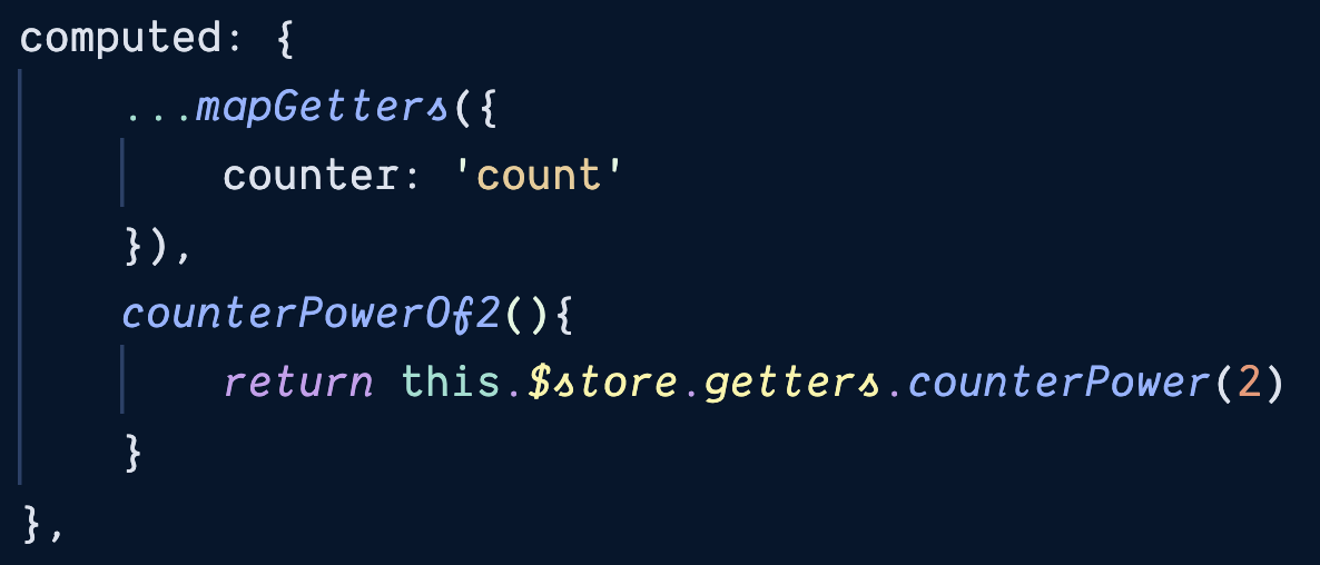 Similar to computed of the component, if we need to derrive state based on store dependencies, we use getters in the store and access them as this.$store.getters in the component