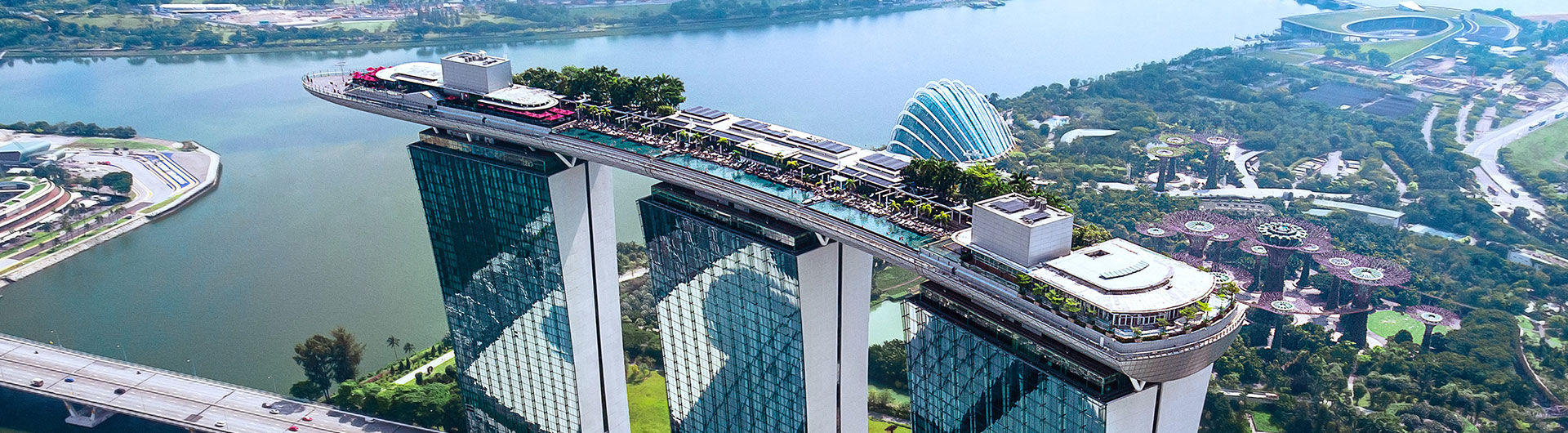 Marina Bay Sands est l'ensemble de trois tours, relié par une grande terrasse. Cette terrasse compte un jardin aussi grand que la tour Eiffel, avec une grande piscine, avec une vue sur la ville. les chambres y sont très luxueuses.