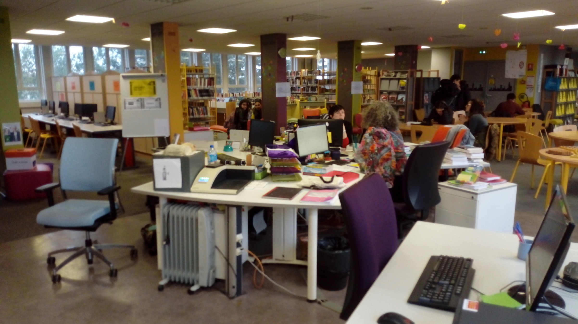 Dans le CDI il y a beaucoup de tables et d'armoires. Il y a aussi une zone ordinateur et une petite pièce pour faire une pause sans que les élèves nous voient.