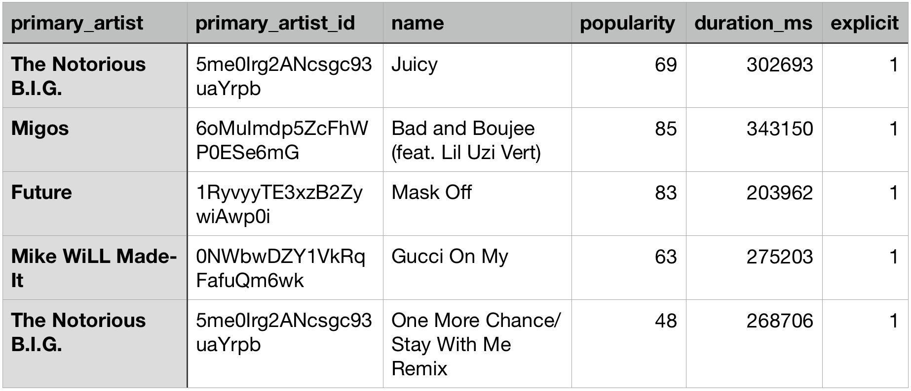 LIMIT 5;| name | popularity | followers |