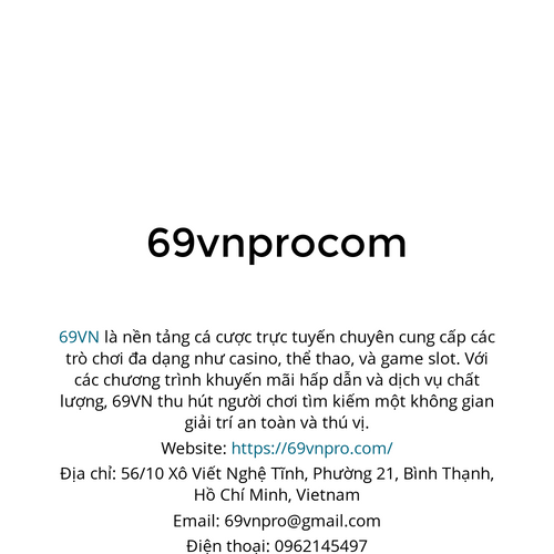 69VN là nền tảng cá cược trực tuyến chuyên cung cấp các trò chơi đa dạng như casino, thể thao, và game slot. Với các chương trình khuyến mãi hấp dẫn và dịch vụ chất lượng, 69VN thu hút người chơi tìm kiếm một không gian giải trí an toàn và thú vị. Website: https://69vnpro.com/ Địa chỉ: 56/10 Xô Viết Nghệ Tĩnh, Phường 21, Bình Thạnh, Hồ Chí Minh, Vietnam Email: 69vnpro@gmail.com Điện thoại: 0962145497 #69vn, #nha_cai_69vn, #link_69vn #dang_ky_69vn, #69vn_casino #69vnpro