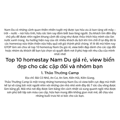 Nam Du có những cảnh quan thiên nhiên tuyệt mỹ được tạo hóa ưu ái ban tặng với mây – trời – nước – núi hữu tình, hữu sắc làm say đắm biết bao lòng người. Du khách tìm đến đây chủ yếu để được nhìn ngắm khung cảnh đó cũng như được thỏa thích hòa mình vào làn nước xanh trong. Xu hướng hiện nay của rất nhiều khách du lịch khi tìm chỗ ở tại đây đó là các homestay vừa thân thiện vừa hiệu quả với giá thành phải chăng. Vì lẽ đó mà hôm nay GTOP làm xin chia sẻ top 10 homestay Nam Du giá rẻ, view biển đẹp dành cho các cặp đôi hoặc nhóm du khách để bạn lựa chọn và quyết định nơi ở phù hợp với nhu cầu của mình nhất nhé!