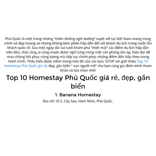 Phú Quốc là một trong những “thiên đường nghỉ dưỡng” tuyệt vời tại Việt Nam mang trong mình vẻ đẹp hoang sơ nhưng không kém phần hấp dẫn đối với khách du lịch trong nước lẫn khách quốc tế. Sau một ngày dài vui tươi khám phá “miệt mài” các điểm du lịch hấp dẫn trên đảo, chắc rằng ai cũng muốn được nghỉ lưng trong một căn phòng ấm áp, hiện đại để mau chóng hồi phục năng lượng mà tiếp tục chinh phục những điểm đến tiếp theo trong hành trình. Thấu hiểu được niềm mong mỏi đó của các bạn, GTOP xin giới thiệu Top 10 homestay Phú Quốc giá rẻ, đẹp, gần biển ” vạn người mê” cho bạn cùng gia đình mình tham khảo và lựa chọn nhé! Top 10 Homestay Phú Quốc giá rẻ, đẹp, gần biển 1. Banana Homestay Địa chỉ: tổ 5, Cây Sao, Hàm Ninh, Phú Quốc.