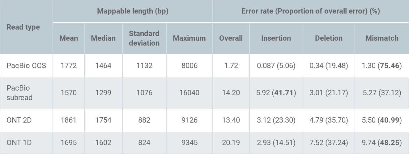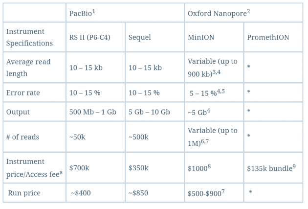 *Weirather JL, de Cesare M, Wang Y et al. Comprehensive comparison of Pacific Biosciences and Oxford Nanopore Technologies and their applications to transcriptome analysis [version 2; referees: 2 approved]. F1000Research 2017, 6:100
