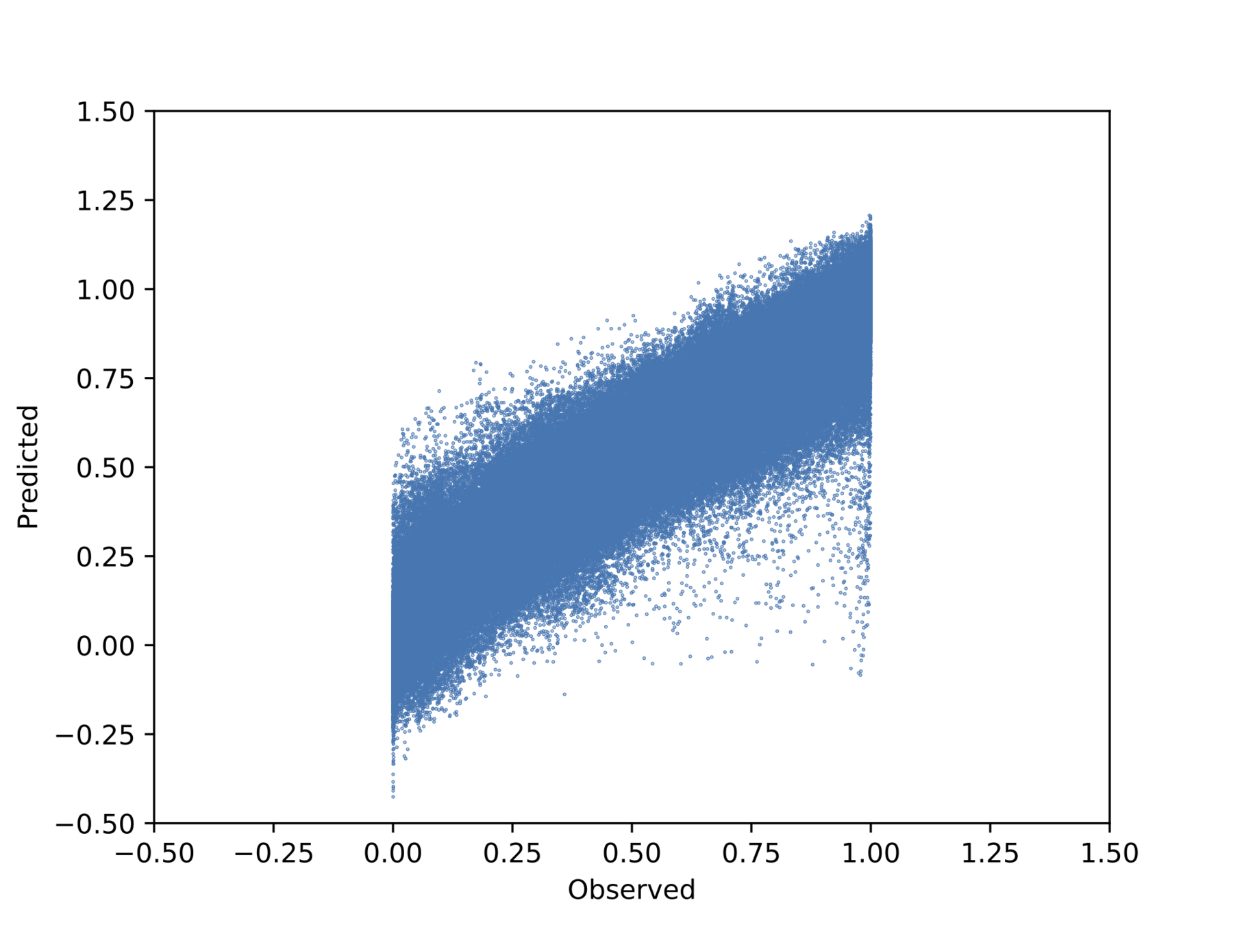 We visualise the predicted and measured property values for each property individually in the plots along a 45° line. The points in the scatter are shaded by the ground truth value of the properties. The grey bars denote 95% confidence intervals approximately corresponding to a \(2\sigma\) interval around the mean prediction. We also note the robustness of the prediction intervals as inaccurate predictions are accompanied by wider error bars.