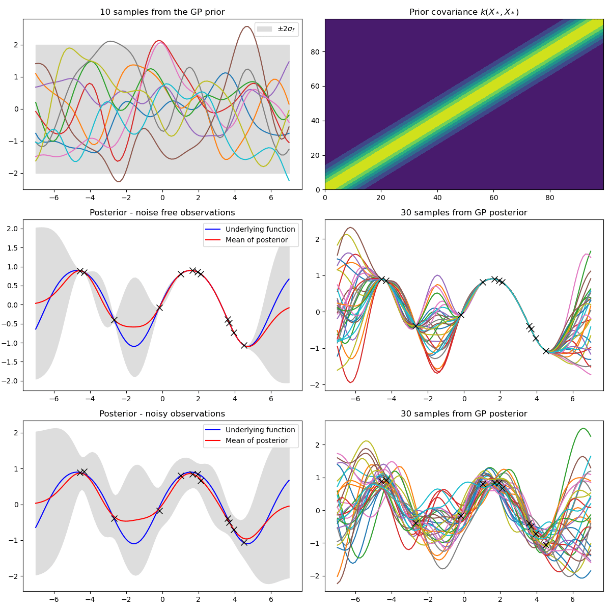 The mathematical crux of a GP is that \( \textbf{f} \equiv [f(x_{1}), f(x_{2}), f(x_{3}),....., f(x_{N})]\) is just a N-dimensional multivariate Gaussian.