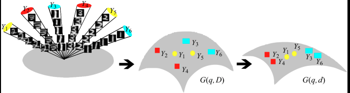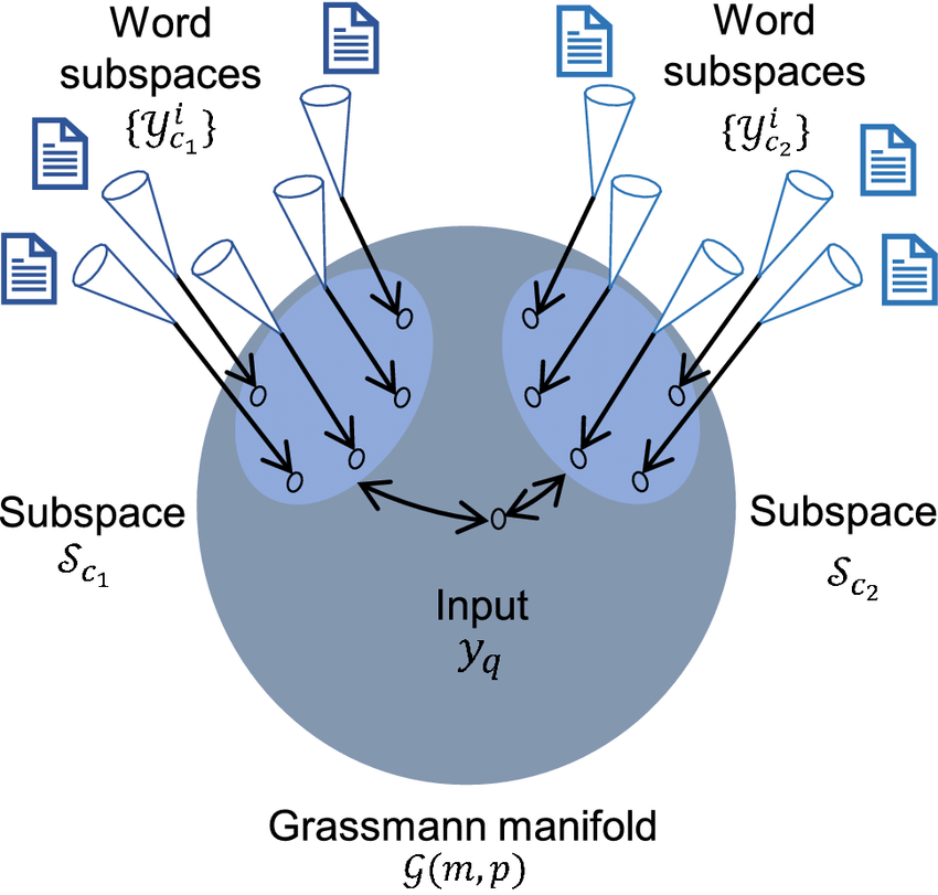 The space Gr(K,D)\mathrm{Gr}(K,D)Gr(K,D) is not Euclidean; its elements are subspaces but what is useful about this view is that it gives a natural metric for comparing subspaces, distances between subspaces, interpolation and traversal.