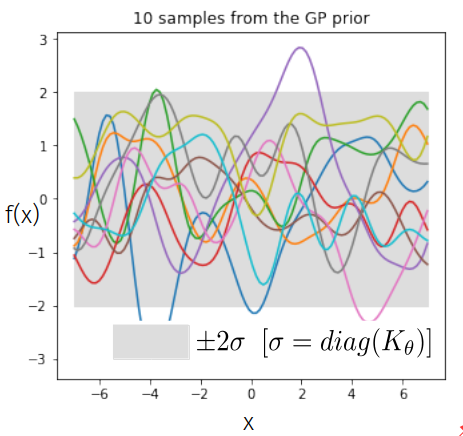 Prior over functions: \( f|\theta \sim \mathcal{GP}(0, k_{\theta}), \bm{f} \sim \mathcal{N}(\bm{0}, K_{\theta}) \)
