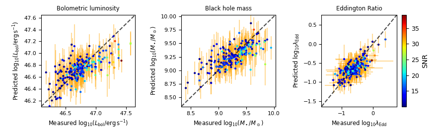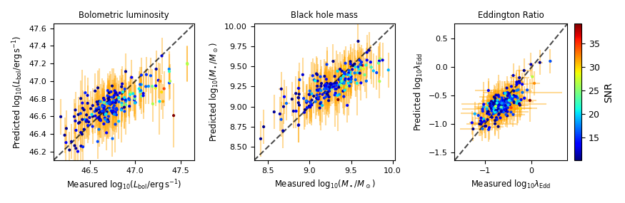 An experiment demonstrating cross-modal prediction \(Y^{*} \longrightarrow Z^{*} \longrightarrow X^{*}\) . In the plots we show generated quasar spectra for simulated labels for black hole mass, bolometric luminosity and Eddington ratio. In each plot we vary the respective scientific label in a reasonable range (shown by the range on the colorbar) while keeping the other labels to fixed values.
