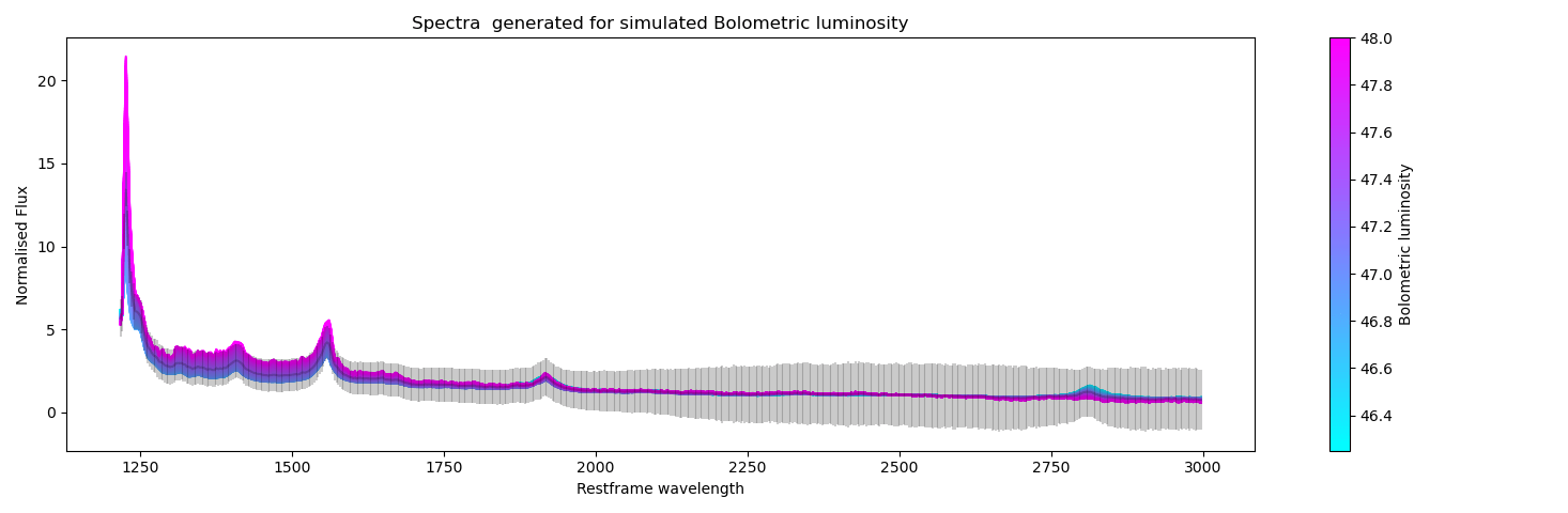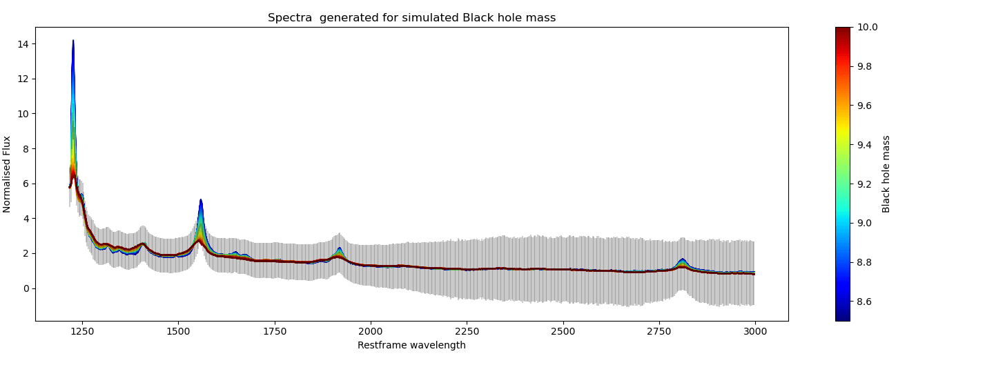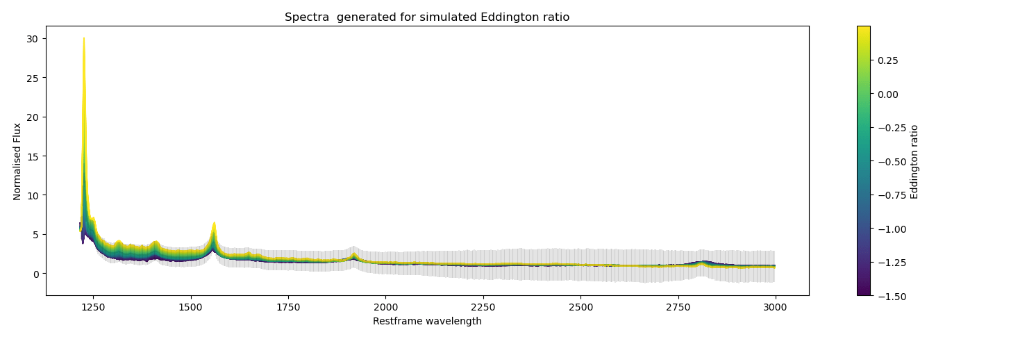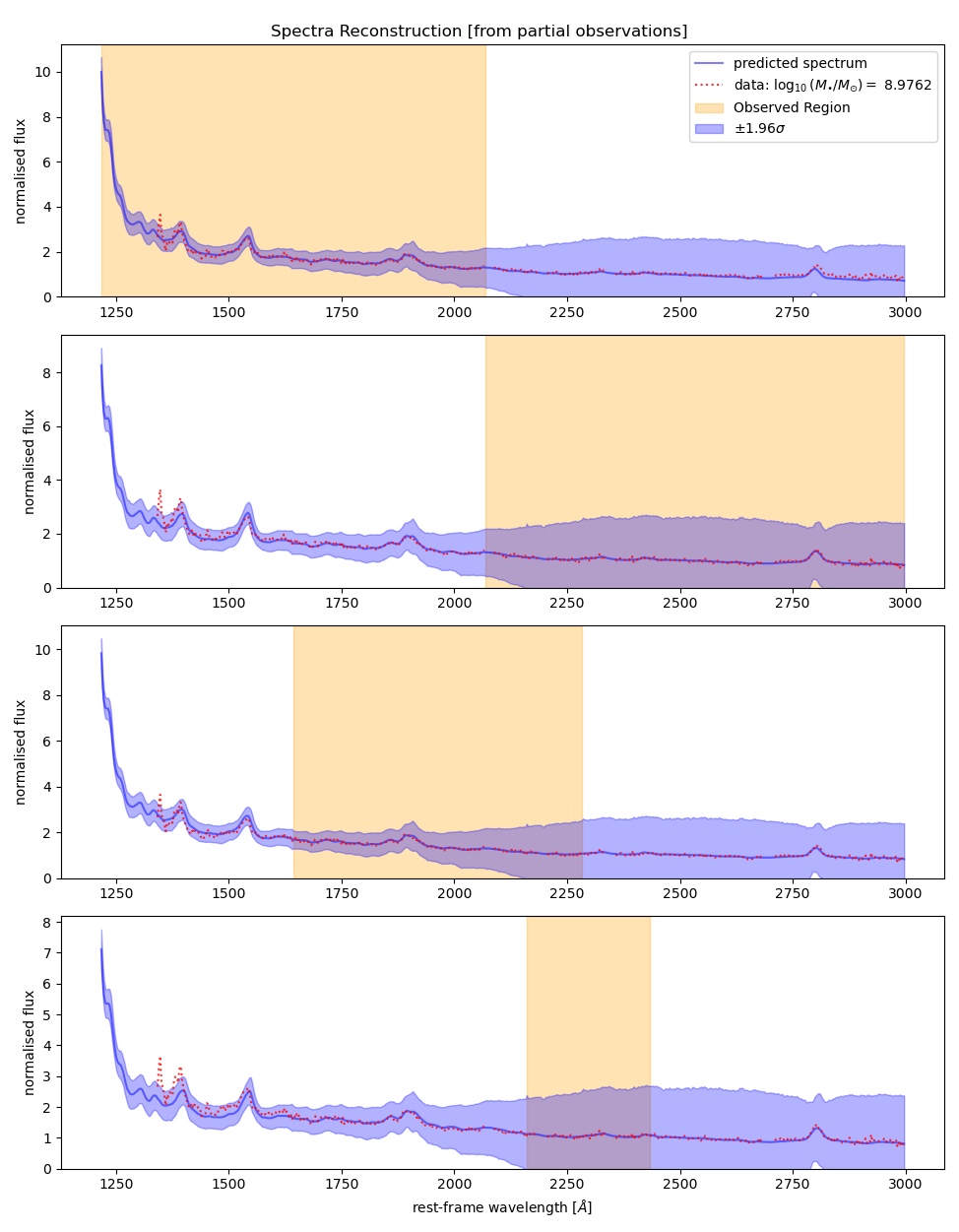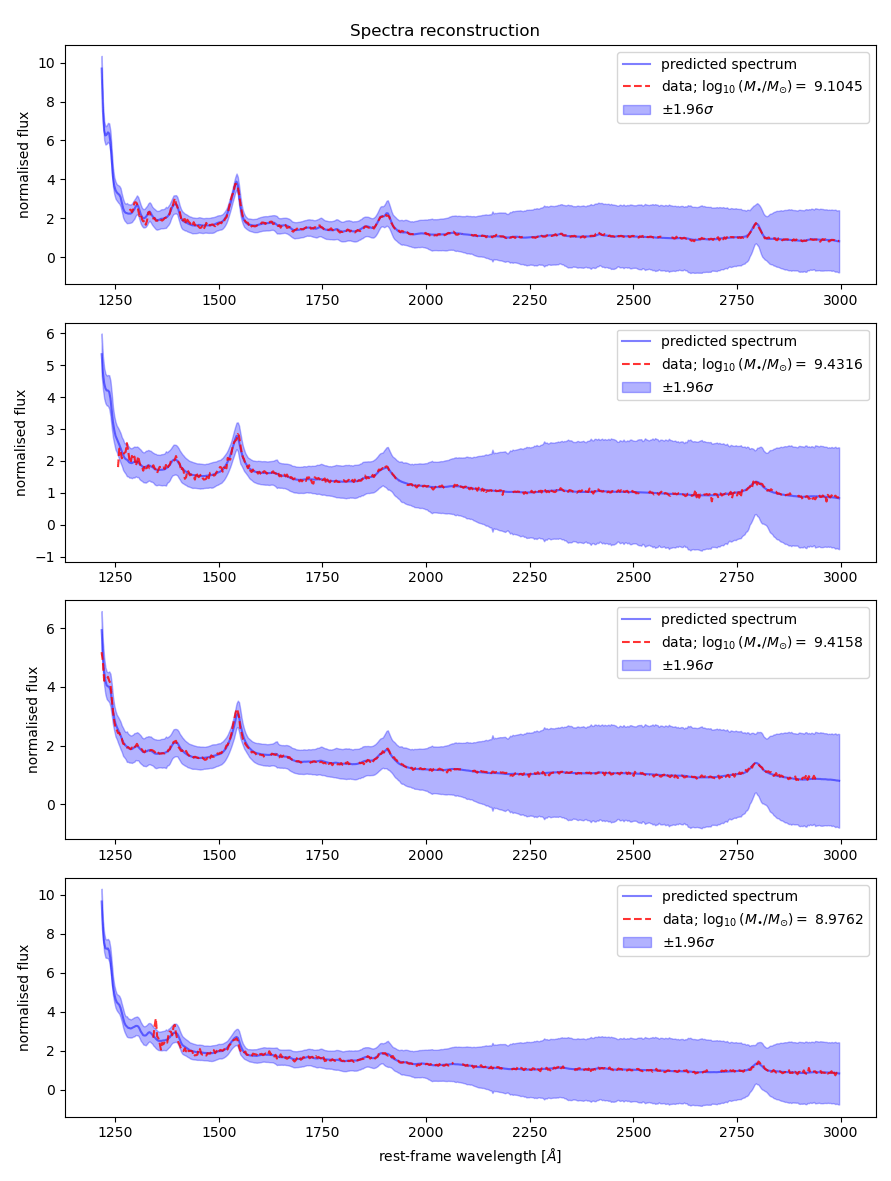 - Missing spectral regions: The rectangular dataset is prepared by shifting the quasars into a restframe wavelength space and re-binning into a common wavelength grid with a fixed pixel scale. Any unobserved pixels are set to NaNs.