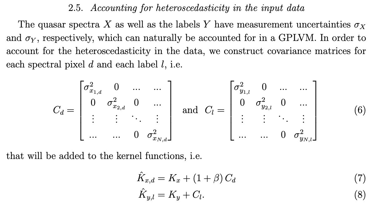 - Heteroscedasticity: The datasets have been constructed by combining measurements from different instruments / telescopes. Hence, due to the different redshift, the quasars cover slightly different rest-frame wavelengths.