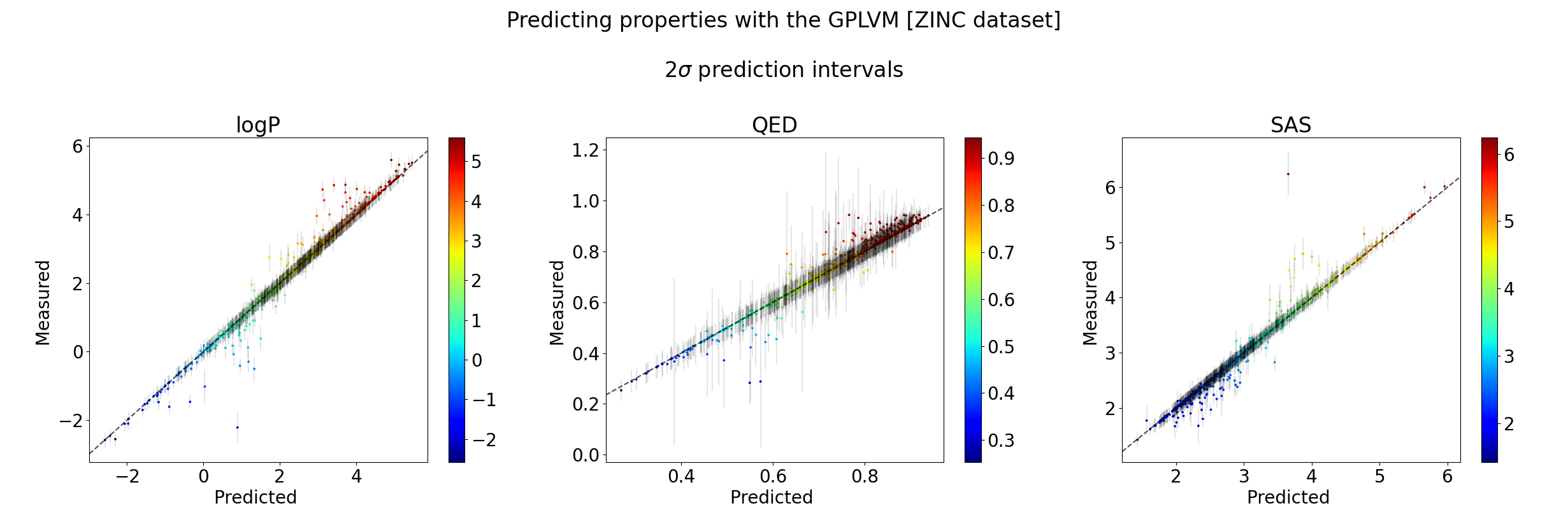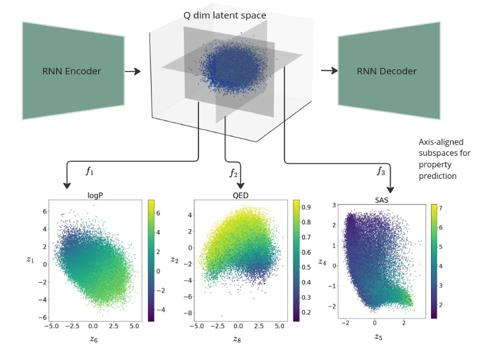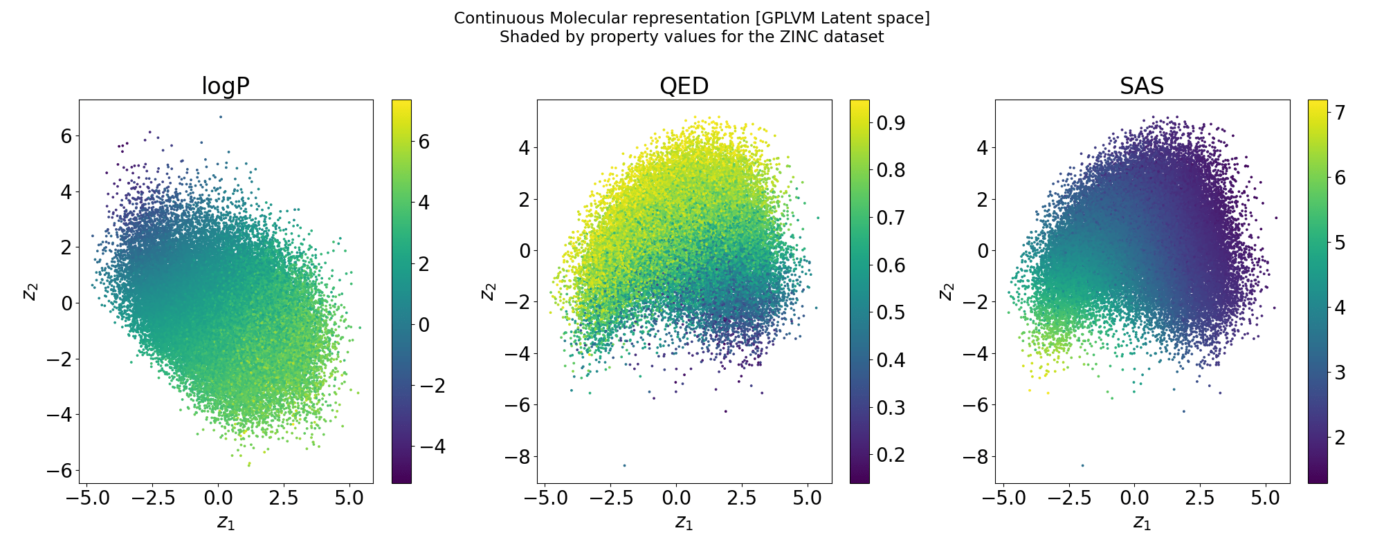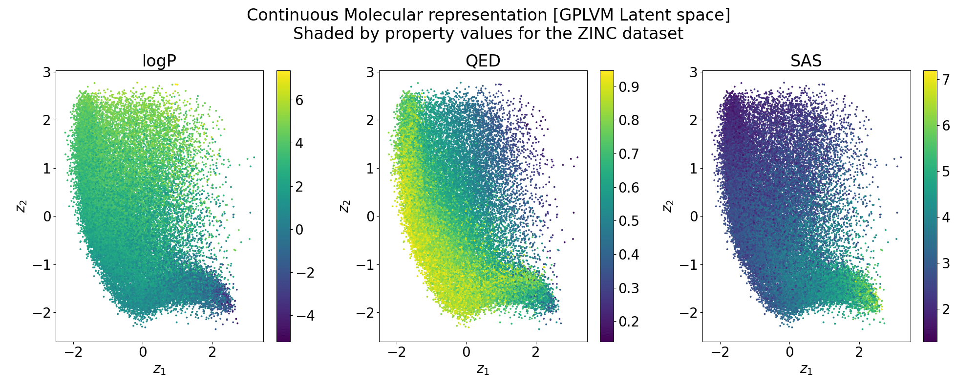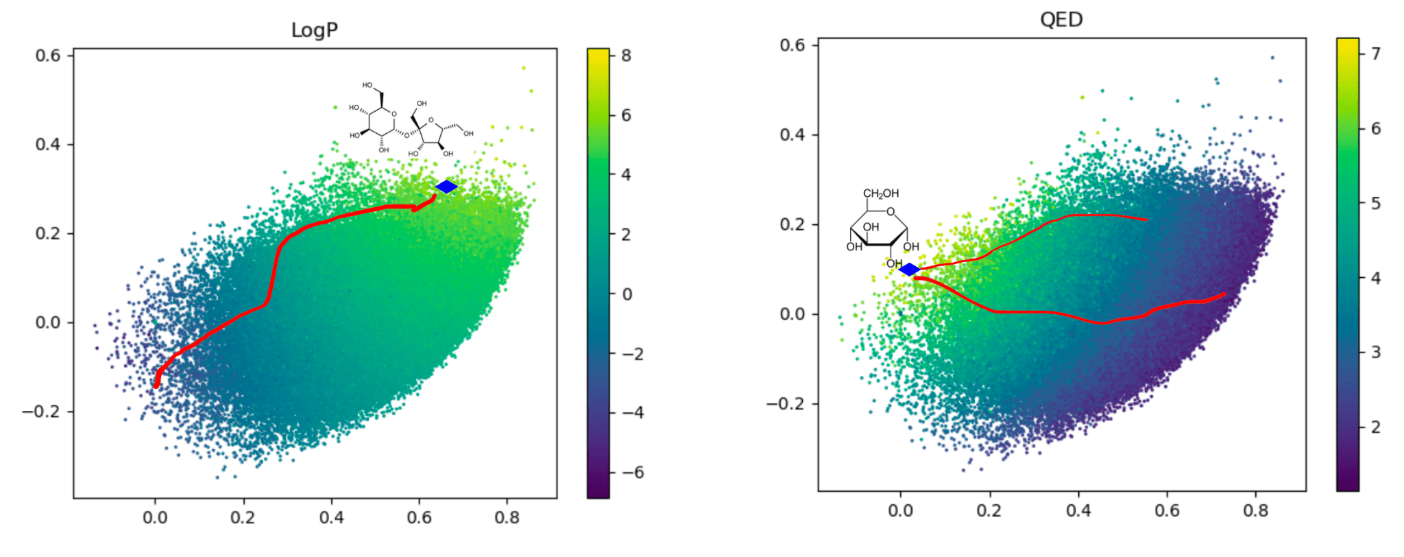 Points shaded by actual QED (drug-likeness) scores